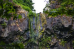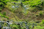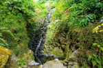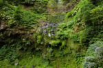 Uma vez no Salto da Inglesa, depois de alguns degraus chegamos à lagoa na beira da cascata. No Verão, quando lá estivemos, o ribeiro tinha pouca água, por isso conseguimos ficar secos. A parede da cascata é densamente coberta de musgo e impressiona pela sua altura.