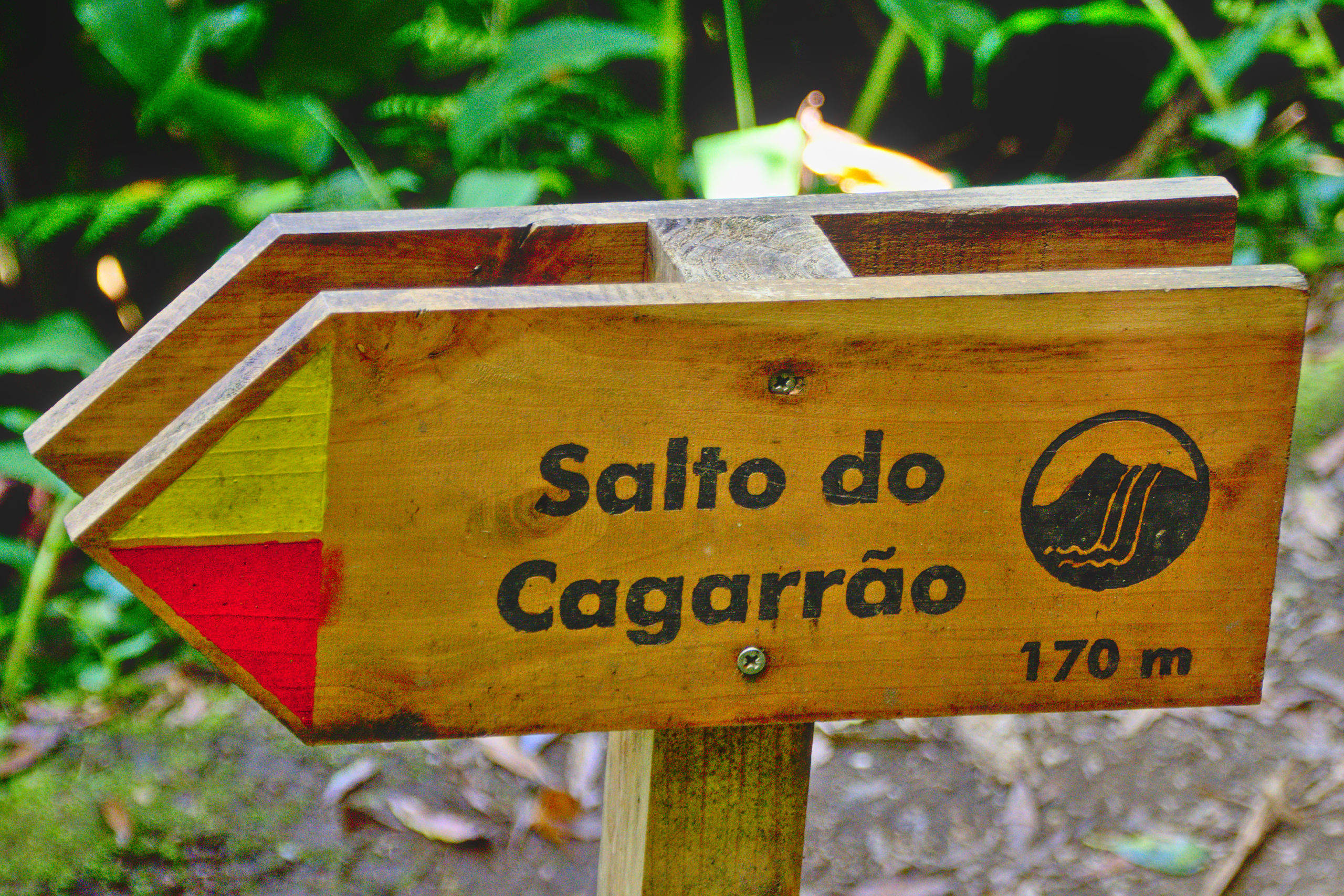 Nach 2,3km erreichen Sie den Salto do Cagarrão. Das Schild weist auf die Stelle hin, wo Sie links hinunter zum Wasserfall abbiegen können.